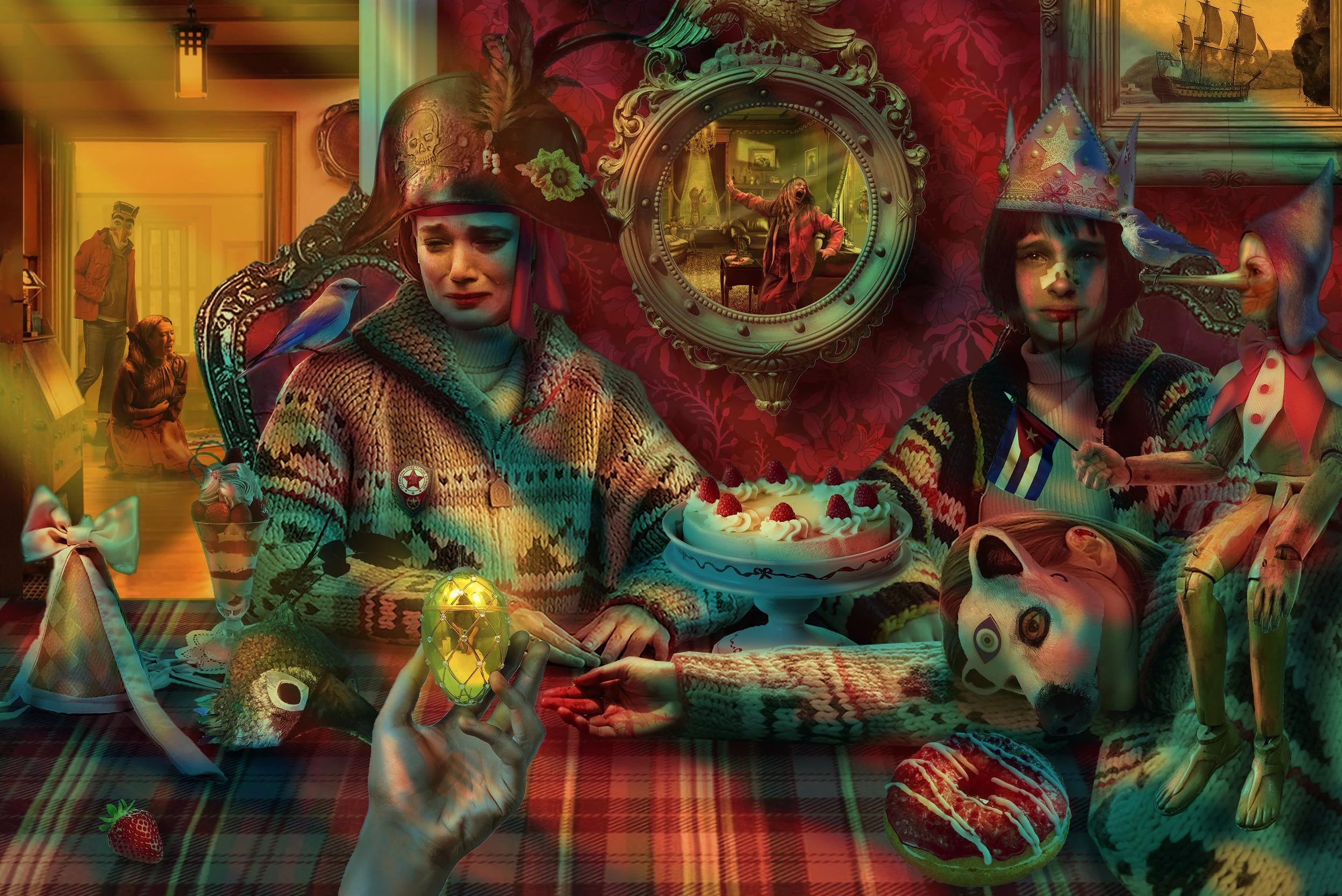 The “Life Styles” series combines satire and social commentary, the parties depicted are a metaphor for the dysfunction and decadence of the ruling class. The scene parodies bourgeoisie grandeur while exposing its absurdities. The animal masks symbolize the dehumanizing effects of power. The pets represent subservience and dependency on authority. Cakes and pastries symbolize gluttony and excess, while the grandiose settings suggest corruption within religious, governmental, and cultural institutions.
