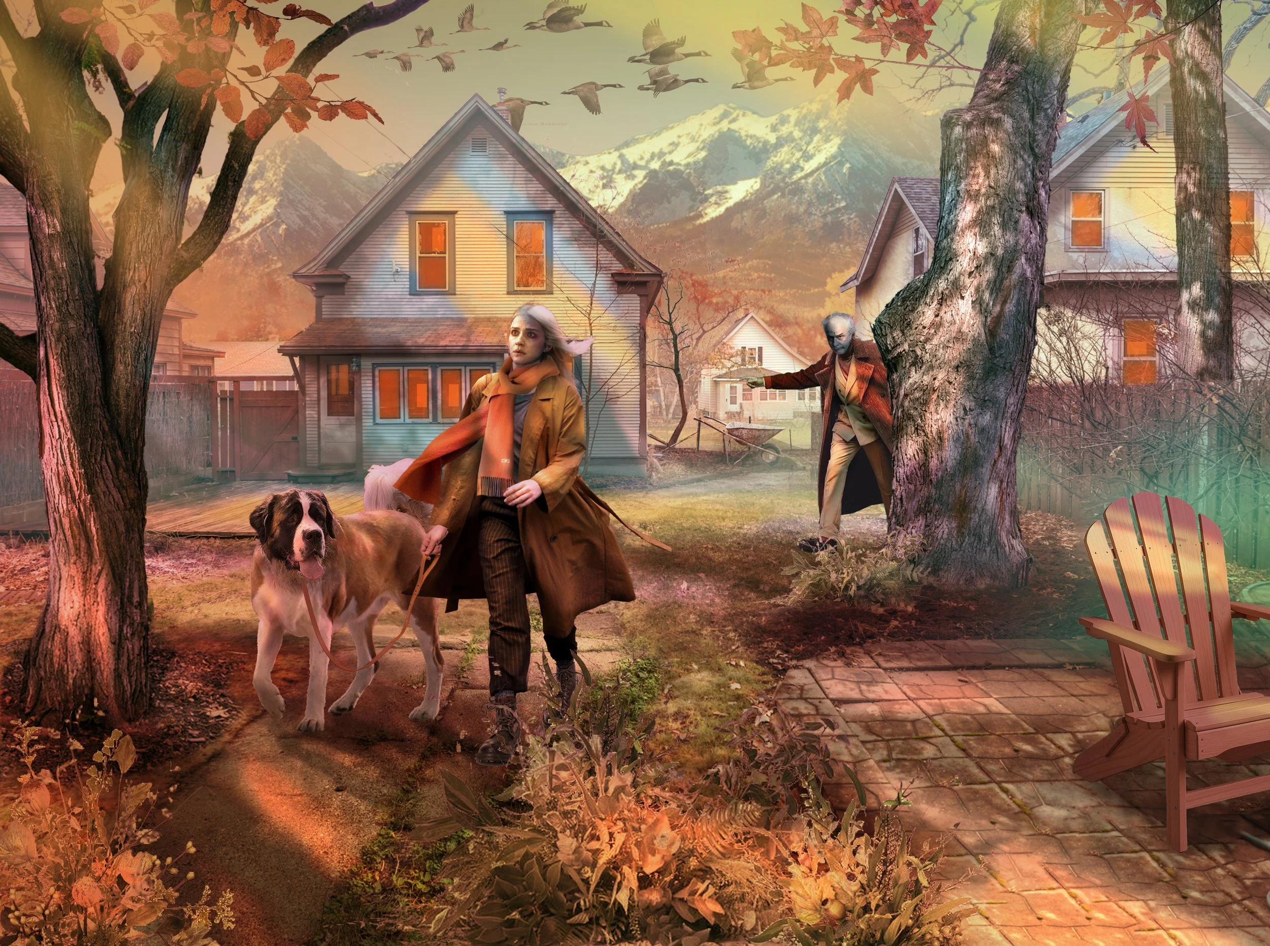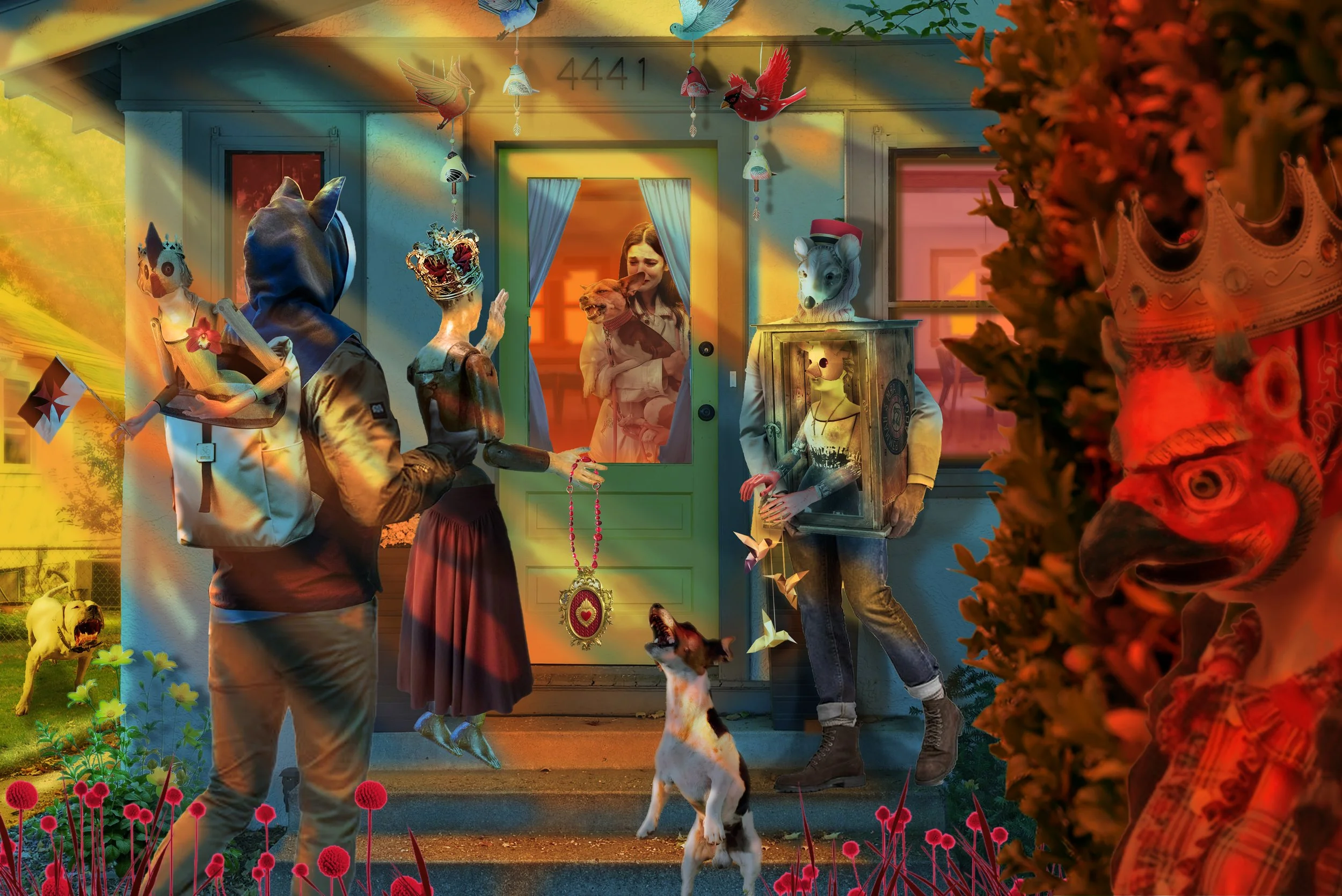 With these new studies, I wanted to push the concept further by incorporating elements of horror, depicting the masked participants of the masquerade ball as they leave their opulent world to terrorize a suburban community.